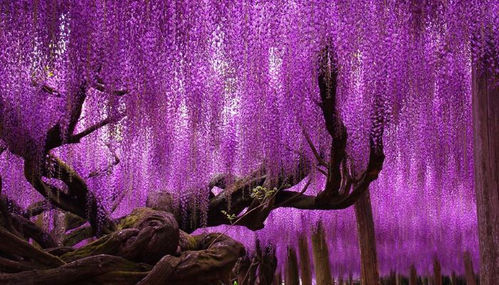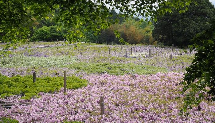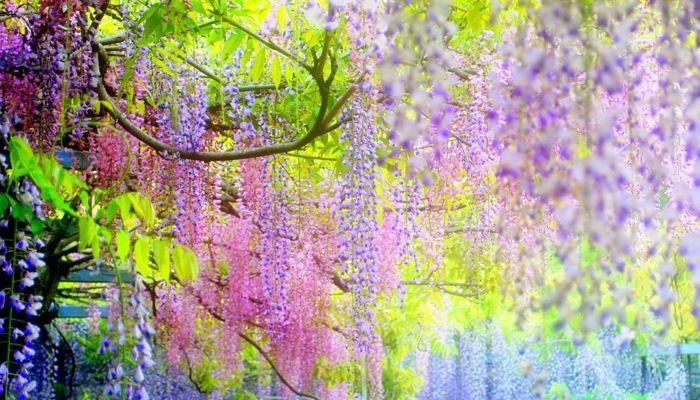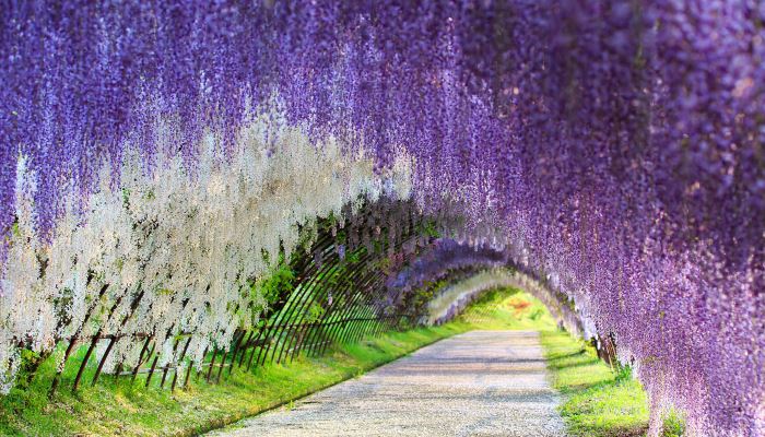 Kawachi Fujien Garden (河内藤園) is a private garden in the wooded hills south of central Kitakyushu, famous for its spectacularly presented, large numbers of wisteria flowers. The garden’s most prominent features are two, roughly 100 meter long tunnels made of wisteria trees of differing varieties and colors, and a collection of large wisteria trees that together form an enormous roof of drooping flowers.