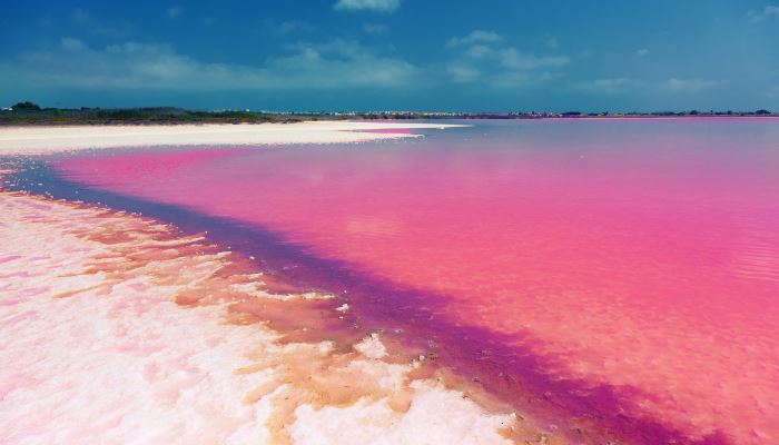 Laguna Salada de Torrevieja is a salt lake near Torrevieja, Spain. The lake’s blushing pink hue is created by a special algae that grows in highly salty water. The algae reacts with sunlight, thus the lake can often appear different colors depending on the time of day. The water in this lake is saltier than sea water, allowing swimmers to float effortlessly on the surface.